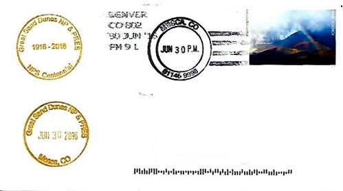 | Hand postal cancellation: "MOSCA, CO 81146-9998 JUN 30 2016". Passport cancellation: "Great Sand Dunes NP & PRES. Mosca, CO. JUN 30 2016". |