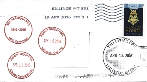 | Hand postal cancellation: "YELLOWTAIL CPU, YELLOWTAIL, MT 59035 APR 18 2016". Passport cancellation: "Bighorn Canyon NRA. Yellowtail Dam VC. APR 18 2016". |