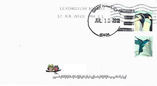 | Hand cancellation: "GRAY HAWK, KY 40434 JUL 12 2018". |