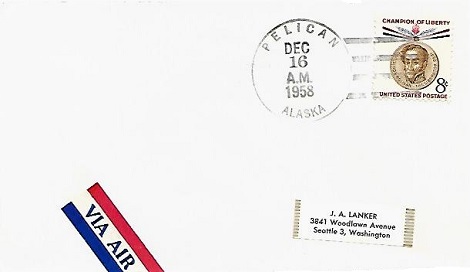 | Hand cancellation: "PELICAN, ALASKA DEC 16 1958". |
