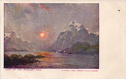 | "Land of the midnight sun". Color printed postcard, UB. Published by American-Journal-Examiner. Copyright 1906. Unused. |