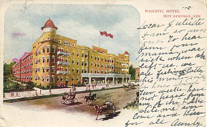 | "Majestic Hotel, Hot Springs, Ark.". Color printed postcard, UB. Publisher not given. Postmarked 1904, Hot Springs, Ark., and Louisville, Ky. |