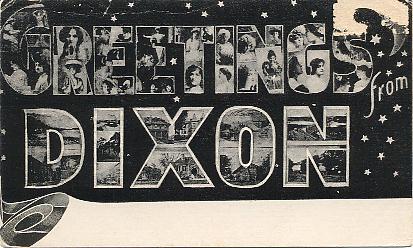 | "Greetings from Dixon". Black & white printed postcard, UB. Publisher not given. Postmarked 1907, Polo, Ill. |