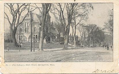 | "City Library, State Street, Springfield, Mass.". Black & white printed postcard, UB. Publisher not given. Number 7. Postmarked 1906, Springfield, Mass., and Butler, Pa. |