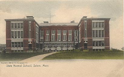 | "State Normal School, Salem, Mass.". Color printed postcard, UB. Published by the Puritan Art Co., Lynn, Mass. Printed by the Rotograph Co. Number 50258. Unused. Copyright 1905. |