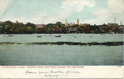 | "Springfield, Mass. viewed from the west banks of the river". Color printed postcard, UB. Published by A. C. Bosselman & Co., New York. Number 1031. WONPU. Date of 1907 in written message. |