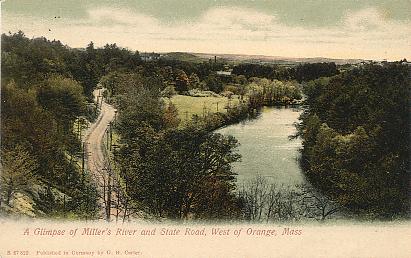 | "A glimpse of Miller's River and state road, west of Orange, Mass.". Color printed postcard, UB. Published by G. H. Carter. Number S87822. Unused. Probably circa 1906. |