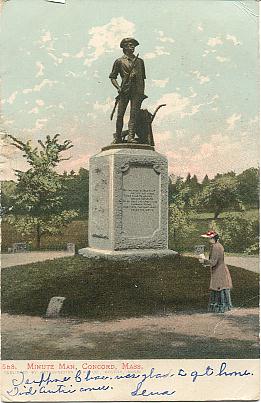 | "Minute Man, Concord, Mass.". Color printed postcard, UB. Published by Metropolitan News Co., Boston, Mass. Number 568. Postmarked 1906, Mansfield, Mass., and Zion City, Ill. |