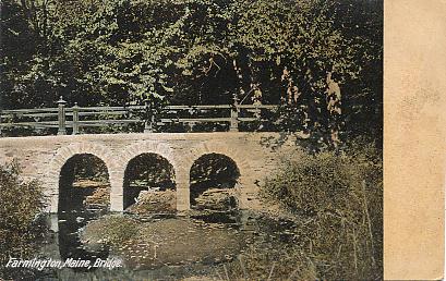 | "Bridge, Farmington, Maine". Color printed postcard, UB. Published by the Hugh C. Leighton Co., Portland, Me. Number 4390. Unused. Probably circa 1906. |