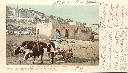 | "Old carreta, Laguna Pueblo, N. M.". Color printed postcard, UB. Published by Detroit Photographic Co. Number 5885. Copyright 1902. Postmarked 1904, Ashfork, Ariz., and San Bernardino, Cal. |