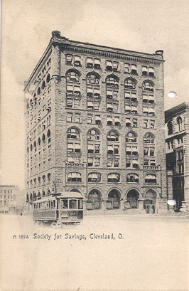 | "Society for Savings, Cleveland, O.". Black & white printed postcard, UB. Published by the Rotograph Co., N. Y. City. Number A1874. Unused. Probably circa 1906. |