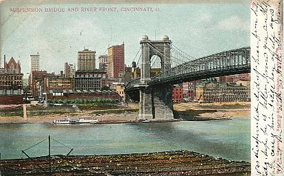 | "Suspension Bridge and River Front, Cincinnati, O.". Color printed postcard, UB. Published by Kraemer Art Co., Cincinnati, O. Number 318. Postmarked 1900, Blackburn, Mo. |