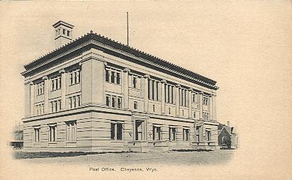 | "Post Office, Cheyenne, Wyo.". Black & white printed postcard, UB. Published by the Colorado News Company, Denver, Colo. Number A1199. Unused. Probably circa 1906. |