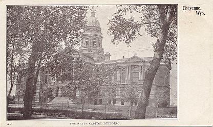 | "The State Capitol Building. Cheyenne, Wyo.". Dark brown printed postcard, UB. Publisher not given. Number A-1 Unused. Probably circa 1906. |