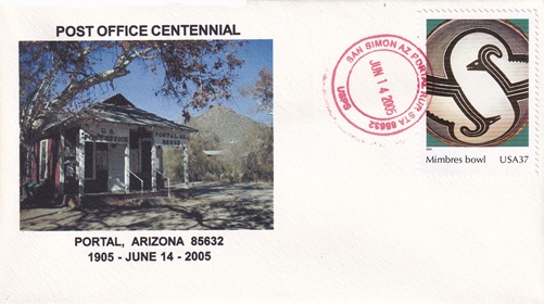 This cacheted cover commemorates the centennial of the Bisbee Post Office. Special hand pictorial & slogan cancellation: "CENTENNIAL STA., BISBEE, AZ 85603 SEPT. 7 1980 | BISBEE POST OFFICE CENTENNIAL 1880 - 1980 |".