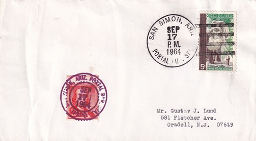 This cacheted cover commemorates President John F. Kennedy and is also for the first day of issue of the John F. Kennedy 5 cents postage stamp. Hand cancellation: "SAN SIMON, ARIZ. MY 29 1964".