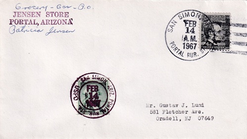 This cacheted cover features the history of San Simon. Two different hand cancellations: "SAN SIMON, AZ 85632 MAR 16 1981", and "SAN SIMON, AZ USPO MAR 16 1981".
