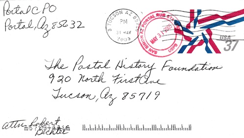 Special hand pictorial & slogan cancellation: "BENSON * DRAGOON STATION, BENSON, AZ 85602, DRAGOON 85609 OCTOBER 13 2001 | 16th ANNUAL PONY EXPRESS RIDE   ALONG THE OLD BUTTERFIELD OVERLAND STAGE ROUTE |".