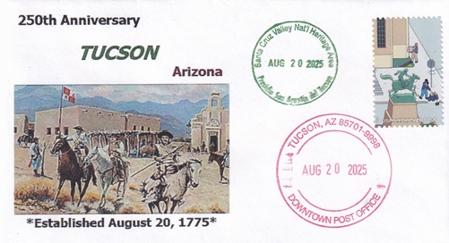 ![]() | This cacheted cover commemorates Tucson's 243rd birthday and is also for the first day of issue of the special Tucson 1775-2018 50 cents postage stamp. Special hand pictorial & slogan cancellation: "OLD PUEBLO STATION, TUCSON, AZ 85719 AUGUST 20 2018 | 243 YEARS TUCSON BIRTHDAY 1775-2018 |". |