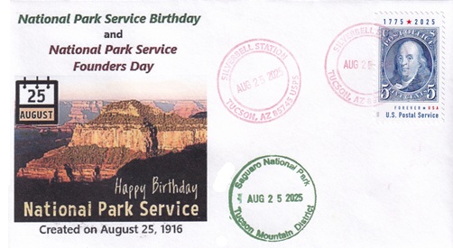 ![]() | This cacheted cover celebrates the 109th anniversary of the U. S. National Park Service. Hand cancellation: "SILVERBELL STATION, TUCSON, AZ 85745 USPS AUG 25 2025". |