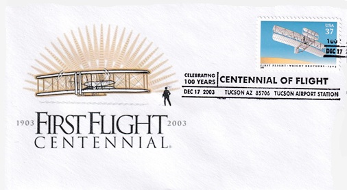 ![]() | This cacheted cover commemorates the 100th anniversary of flight. Special hand slogan cancellation: "TUCSON AIRPORT STATION, TUCSON, AZ 85706 DEC 17 2003 | CENTENNIAL OF FLIGHT CELEBRATING 100 YEARS | ". |