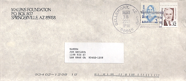 | Hand cancellation: "BELLEMONT CPU, AZ 86015 MAY 18 2001". |
