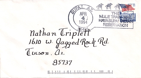 | Hand pictorial & slogan cancellation: "SUPAI, AZ 86435 APR 4 1994 | THE MULE TRAIN MAIL HAVASUPAI INDIAN RESERVATION |". |