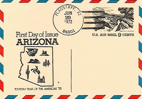 | This cacheted cover is for the first day of issue of the Tourism Year of the Americas '72 Grand Canyon 9 cents airmail postal card. Hand cancellation: "FLAGSTAFF, AZ 86001 JUN 29 1972". |