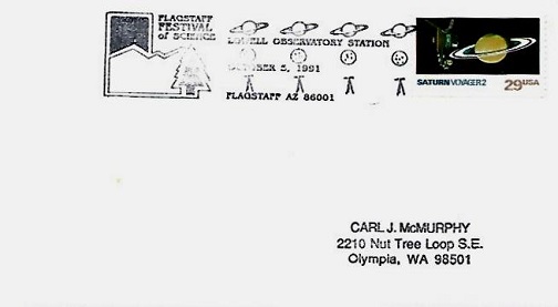 | Special hand pictorial & slogan cancellation: "LOWELL OBSERVATORY STATION, FLAGSTAFF, AZ 86001 OCTOBER 5, 1991 | FLAGSTAFF FESTIVAL of SCIENCE |". |