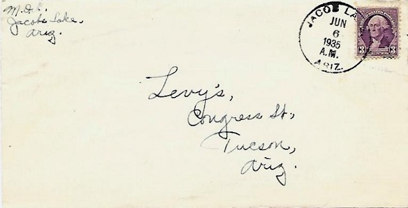 | Hand cancellation: "STONEMAN LAKE, ARIZ. JUL ? 1929". |