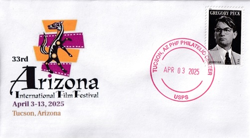 | This cacheted cover features the 33rd Arizona International Film Festival. Hand cancellation: "PHF PHILATELIC CENTER, TUCSON, AZ USPS APR 3 2025". |
