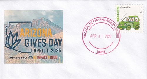 | This cacheted cover promotes Arizona Gives Day. Hand cancellation: "PHF PHILATELIC CENTER, TUCSON, AZ USPS APR 1 2025". |