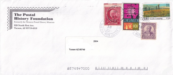 The PHF Philatelic Center Contract Post Office opened in 1992 and is located in the Postal History Foundation and Museum (PHF) building at 920 N. First Avenue, Tucson, Arizona. Here is its official USPS webpage. For information about the Postal History Foundation and more about its post office go to its website. This exhibit shows envelopes and postcards (referred to as covers) with postmarks from the PHF Philatelic Center Contract Post Office. Also included are special pictorial and slogan cancellations sponsored by the PHF and its contract post office and generally in use for only one day (TPS). These special pictorial postmarks have an 85719 ZIP code.