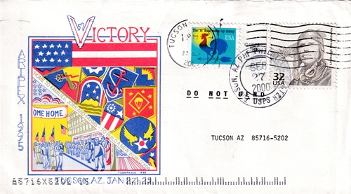 | This cacheted cover honors Memorial Day 2000. Hand cancellation: "PHF PHILATELIC CENTER, TUCSON, AZ USPS MAY 30 2000". |