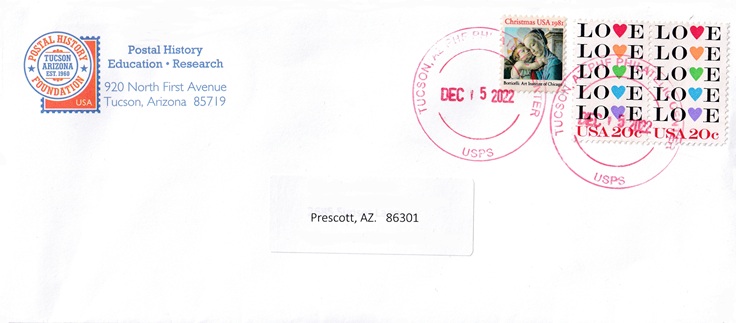 | Hand cancellation: "PHF PHILATELIC CENTER, TUCSON, AZ USPS DEC 15 2022". |