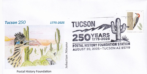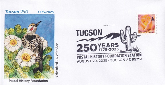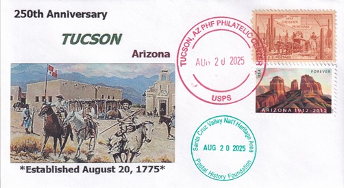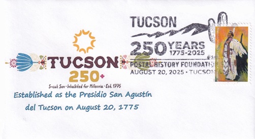 | This cacheted cover commemorates the 250th anniversary of Tucson, AZ. Hand cancellation: "PHF PHILATELIC CENTER, TUCSON, AZ USPS AUG 20 2025". |