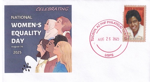 | This cacheted cover celebrates National Women's Equality Day. Hand cancellation: "PHF PHILATELIC CENTER, TUCSON, AZ USPS AUG 26 2025". |