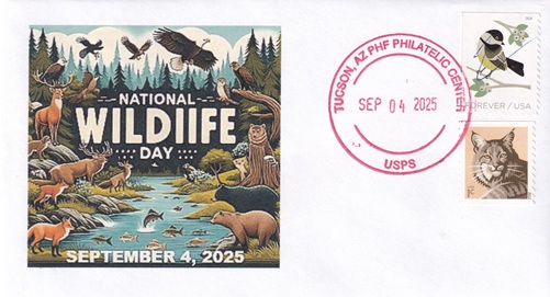 | This cacheted cover celebrates National Wildlife Day. Hand cancellation: "PHF PHILATELIC CENTER, TUCSON, AZ USPS SEP 4 2025". |