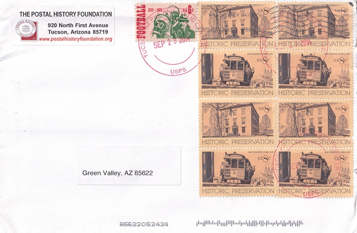 | Hand cancellation: "PHF PHILATELIC CENTER, TUCSON, AZ USPS SEP 27 2000". |