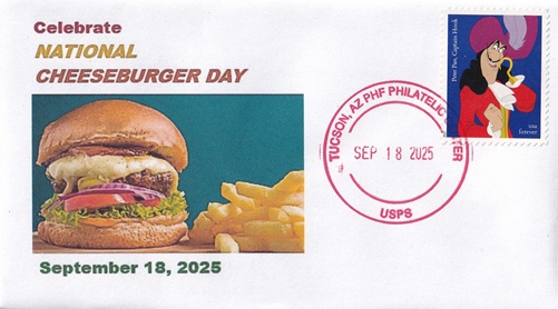 | This cacheted cover "promotes" National Cheeseburger Day. Hand cancellation: "PHF PHILATELIC CENTER, TUCSON, AZ USPS SEP 18 2025". |