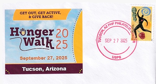 | This cacheted cover promotes Tucson's Hunger Walk 2025. Hand cancellation: "PHF PHILATELIC CENTER, TUCSON, AZ USPS SEP 27 2025". |