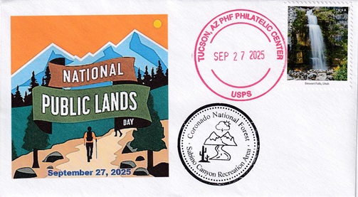 | This cacheted cover celebrates National Public Lands Day. Hand cancellation: "PHF PHILATELIC CENTER, TUCSON, AZ USPS SEP 27 2025". |