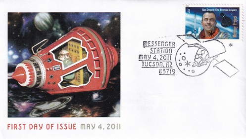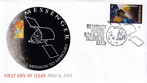| These two cacheted covers feature the Messenger Mission to Mercury and the Mercury Project. Special hand pictorial cancellations: "MESSENGER STATION, TUCSON, AZ 85719 MAY 4, 2011". [TPS] |