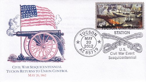 | These two cacheted covers commemorate the U. S. Civil War in Tucson. Special hand pictorial & slogan cancellations: "TUCSON UNIFICATION STATION, TUCSON, AZ 85719 MAY 20 2012 | U.S. Civil War Event Sesquicentennial |". [TPS] |