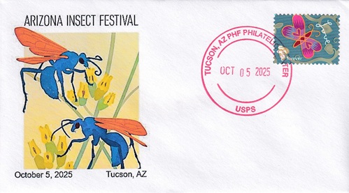 | This cacheted cover promotes the Arizona Insect Festival. Hand cancellation: "PHF PHILATELIC CENTER, TUCSON, AZ USPS OCT 5 2025". |