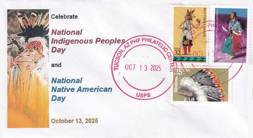 | This cacheted cover celebrates National Indigenous Peoples Day. Hand cancellation: "PHF PHILATELIC CENTER, TUCSON, AZ USPS OCT 13 2025". |