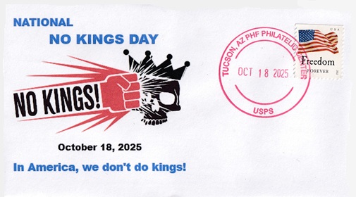 | This cacheted cover promotes National No Kings Day. Hand cancellation: "PHF PHILATELIC CENTER, TUCSON, AZ USPS OCT 18 2025". |