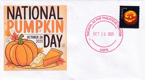 | This cacheted cover features National Pumpkin Day. Hand cancellation: "PHF PHILATELIC CENTER, TUCSON, AZ USPS OCT 26 2025". |