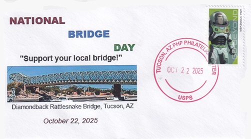 | This cacheted cover "supports" National Bridge Day. Hand cancellation: "PHF PHILATELIC CENTER, TUCSON, AZ USPS OCT 22 2025". |