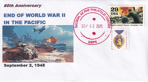 | This cacheted cover commemorates the end of World War II in the Pacific. Hand cancellation: "PHF PHILATELIC CENTER, TUCSON, AZ USPS SEP 2 2025". |